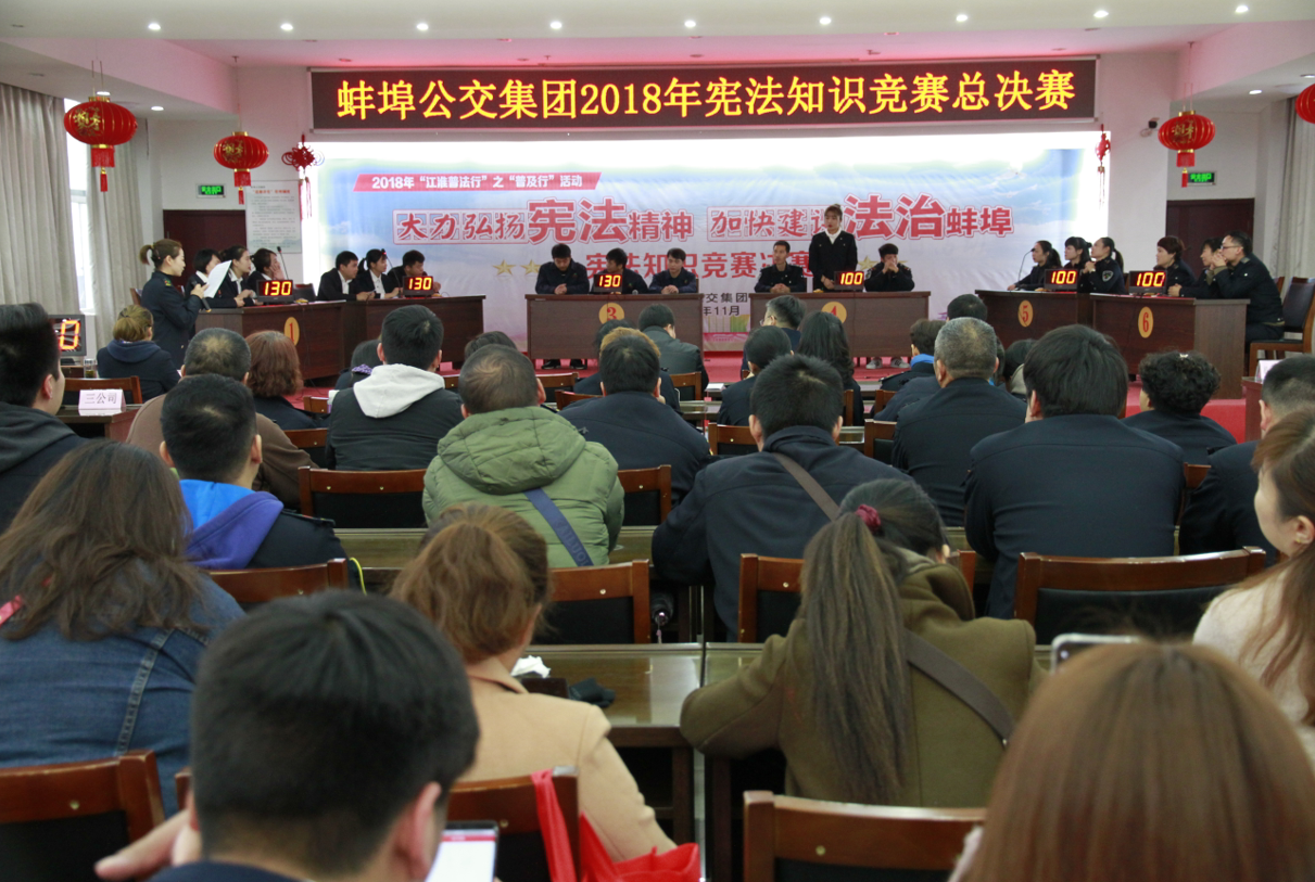 為做好《憲法修正案》的學(xué)習(xí)宣傳工作,進(jìn)一步加深廣大員工的憲法意識(shí), 11月7日,公交集團(tuán)以“大力弘揚(yáng)憲法精神,加快建設(shè)法治蚌埠”為主題的 2018年憲法知識(shí)競(jìng)賽圓滿落幕。來(lái)自集團(tuán)公司的14支代表隊(duì)參加競(jìng)賽,經(jīng)過筆試預(yù)賽,6支代表隊(duì)脫穎而出,進(jìn)入當(dāng)天的決賽。