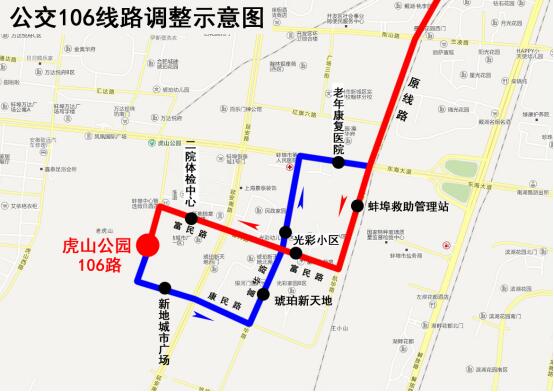 線路調(diào)整后原106路“光彩小區(qū)”站改為“蚌埠救助管理站”、原“富民路•富華路”站改為“光彩小區(qū)”站;同時(shí)在富民路上增設(shè)“二院體檢中心”、康民路上增設(shè)“新地城市廣場”、富華路上增設(shè)“琥珀新天地”站。