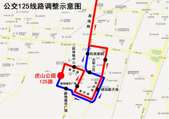 線路調(diào)整后原125路“老年康復(fù)醫(yī)院”、“光彩小區(qū)終點(diǎn)站”將不再停靠125路;同時(shí)在富華路上增設(shè)“光彩小區(qū)(下客站)”、“琥珀新天地”站;富民路上增設(shè)“光彩小區(qū)(上客站)”、“二院體檢中心(下客站)”站;康民路上增設(shè)“新地城市廣場(上客站)”站。