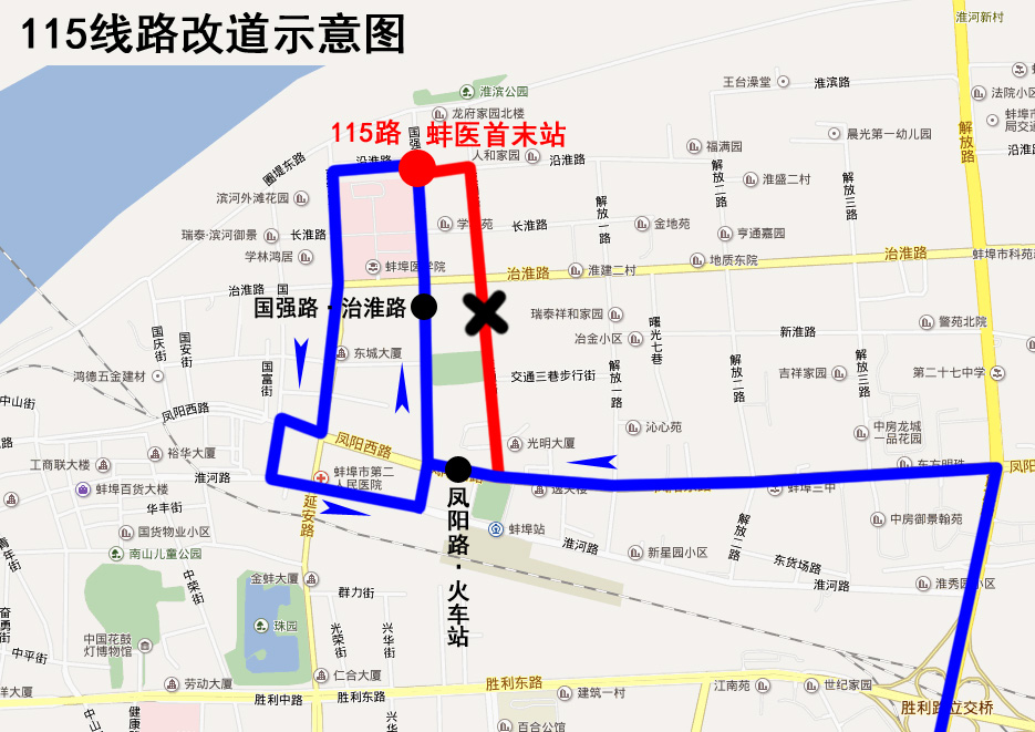 115路公交車改道公告 因交通路(鳳陽路至圈堤路)封閉施工,2019年4月13日起,公交115路高鐵南站至蚌醫(yī)首末站方向改道為:原線路—鳳陽路—國強路—蚌醫(yī)首末站。蚌醫(yī)首末站至高鐵南站方向保持不變。 改道期間公交車將取消停靠“交通路•火車站”、“交通路•光明街”、“地方海事局”站。臨時停靠“鳳陽路•火車站”、“國強路•治淮路”站,封閉施工結束后恢復原線。