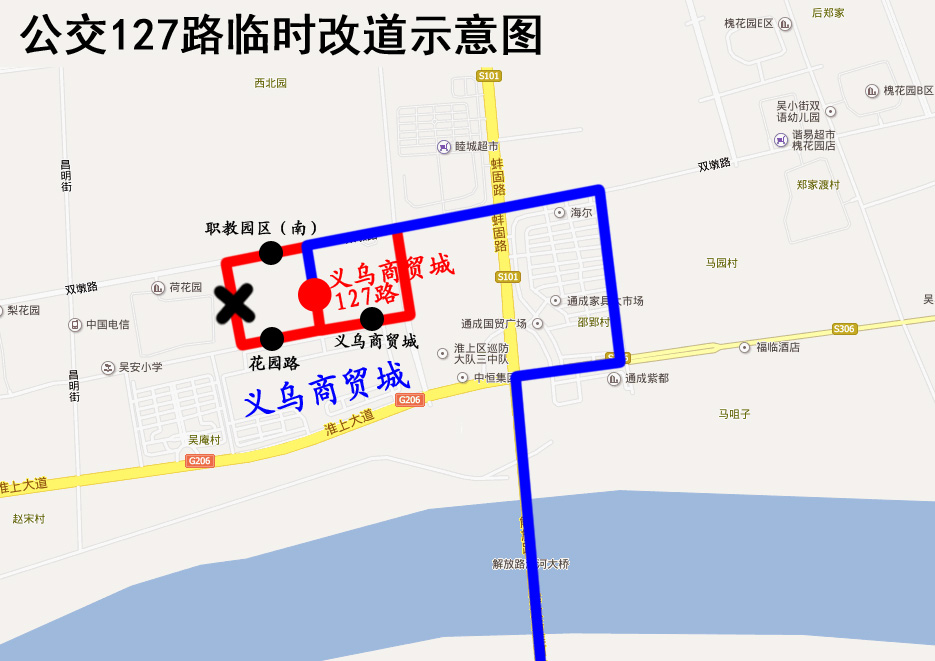 127路公交車臨時改道公告 因花園路(永平街至昌平街)封閉施工,2019年4月18日起,公交127路來回雙向改道為:原線路—雙墩路—馬園路—原線路。高鐵南站至義烏商貿城方向保持不變。 改道期間公交車將取消停靠“職教園區(南)”、“花園路”、“義烏商貿城(花園路上客站)”站。封閉施工結束后恢復原線。