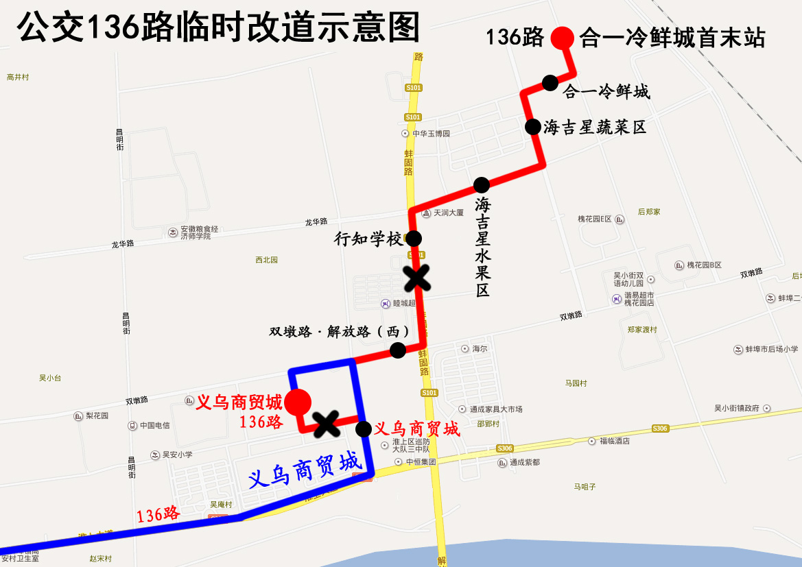 改道期間公交車將取消停靠“合一冷鮮城首末站”、“合一冷鮮城”、“海吉星蔬菜區”、“海吉星水果區”、“行知學校”、“雙墩路•解放路(西)”站。封閉施工結束后恢復原線。
