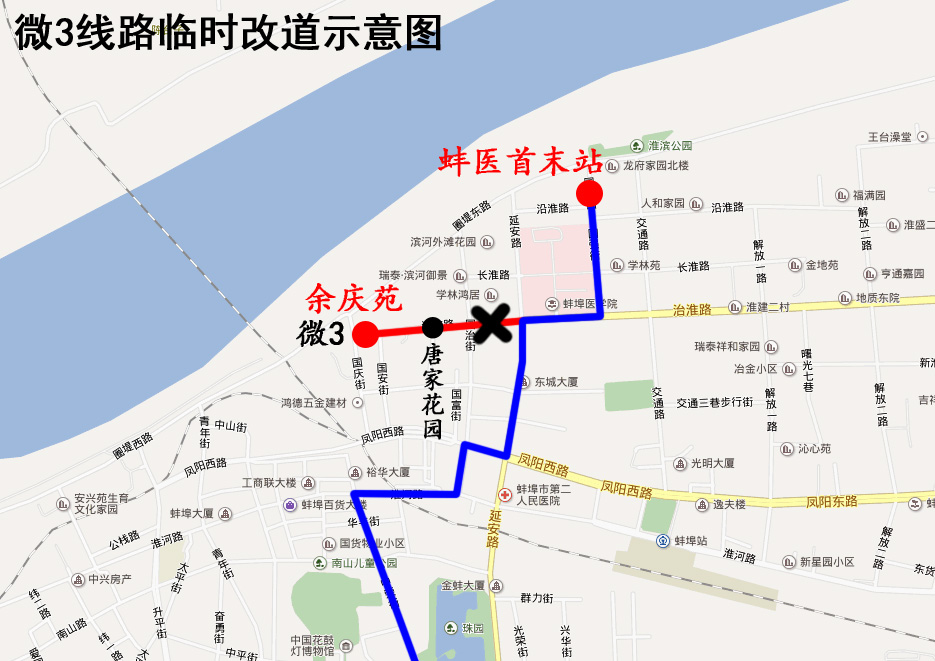因治淮路西段(國治街至延安路)封閉施工,2019年7月20日起,公交微3線路來回雙向改道為:客運南站—原線路—延安路—治淮路—國強路—蚌醫首末站。