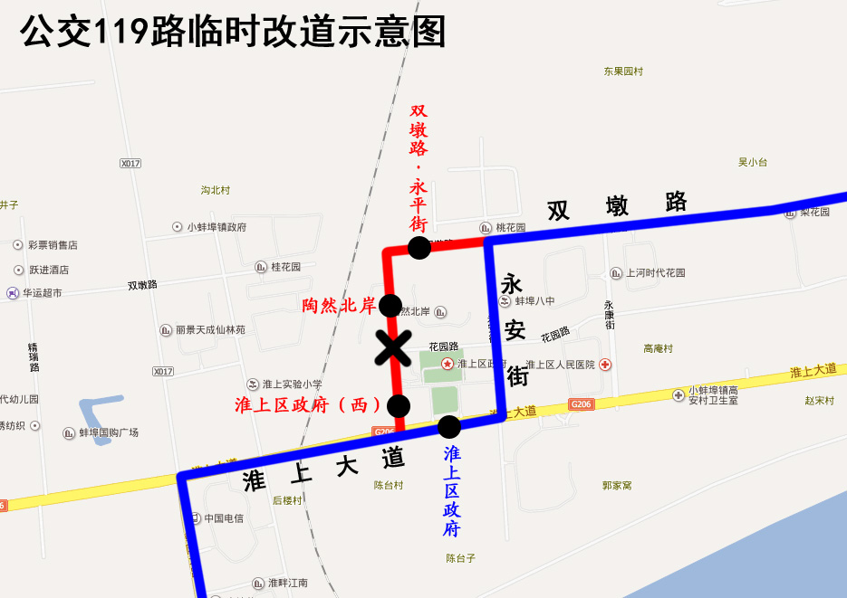 119路公交車臨時(shí)改道公告 因永平街與花園路路口封閉施工,2019年10月16日起,公交119路來回雙向改道為雙墩路—永安街—淮上大道營運(yùn)。改道期間公交車將取消停靠“淮上區(qū)政府(西)”、“陶然北岸”、“雙墩路•永平街”站,臨時(shí)雙向停靠“淮上區(qū)政府”站。