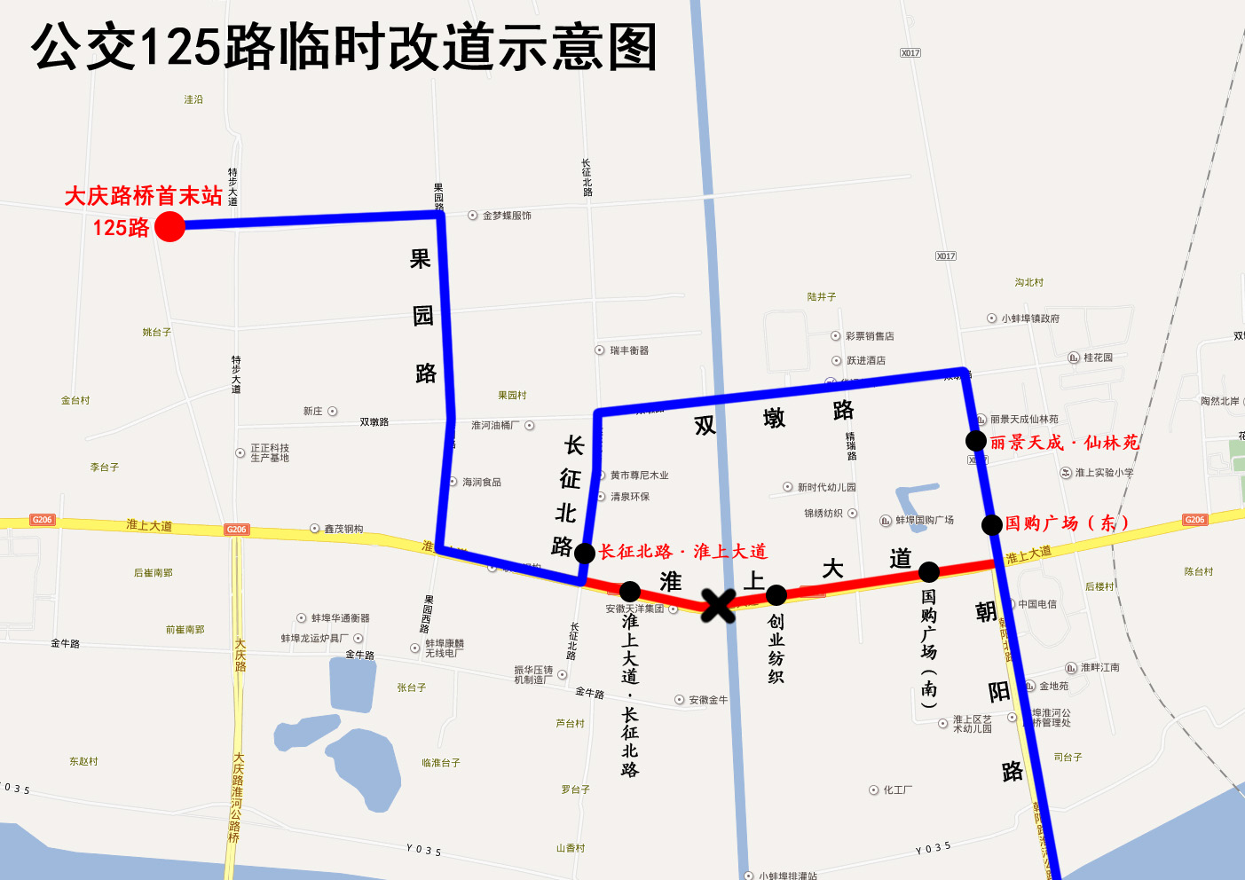 接上級(jí)通知,因淮上大道路面損壞嚴(yán)重,公交車無法通行。自2020年1月6日起,公交125路由:“原線路—淮上大道—朝陽路—原線路”調(diào)整為“原線路—淮上大道—長(zhǎng)征北路—雙墩路—朝陽路—原線路”。改道期間,公交車將取消停靠“淮上大道?長(zhǎng)征北路”、“創(chuàng)業(yè)紡織”、“國(guó)購廣場(chǎng)(南)”站。臨時(shí)停靠“國(guó)購廣場(chǎng)(東)”、“麗景天成?仙林苑”站。待路面滿足公交車通行條件后將恢復(fù)原線。