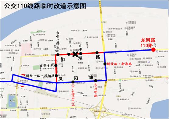 因治淮路部分道路封閉施工,自3月30日起,公交110路來回雙向改道為:龍河路—解放路—鳳陽路—原線路—客運南站。